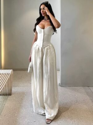 The crop top offers a flattering fit, while the high-waisted long skirt creates an elegant, elongated silhouette.