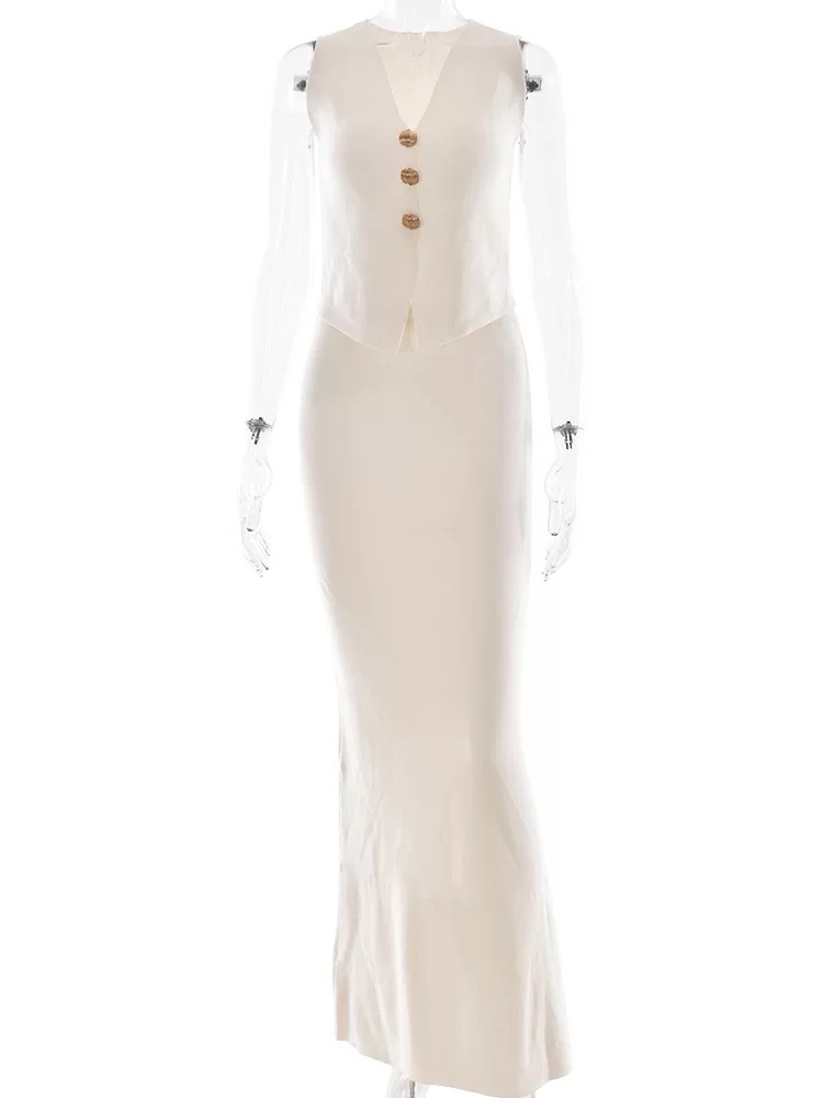 The crop top offers a flattering fit, while the high-waisted long skirt creates an elegant, elongated silhouette.